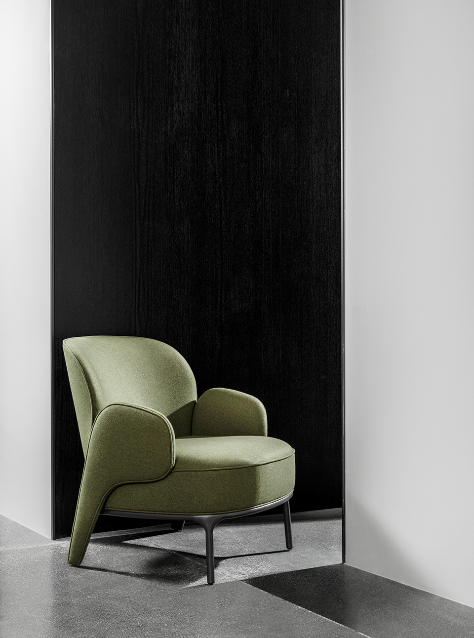 Upholstered with fabric or leather. Metal feet and frame in dark grey epoxy paint finish.?SEAT HEIGHT: 400MM