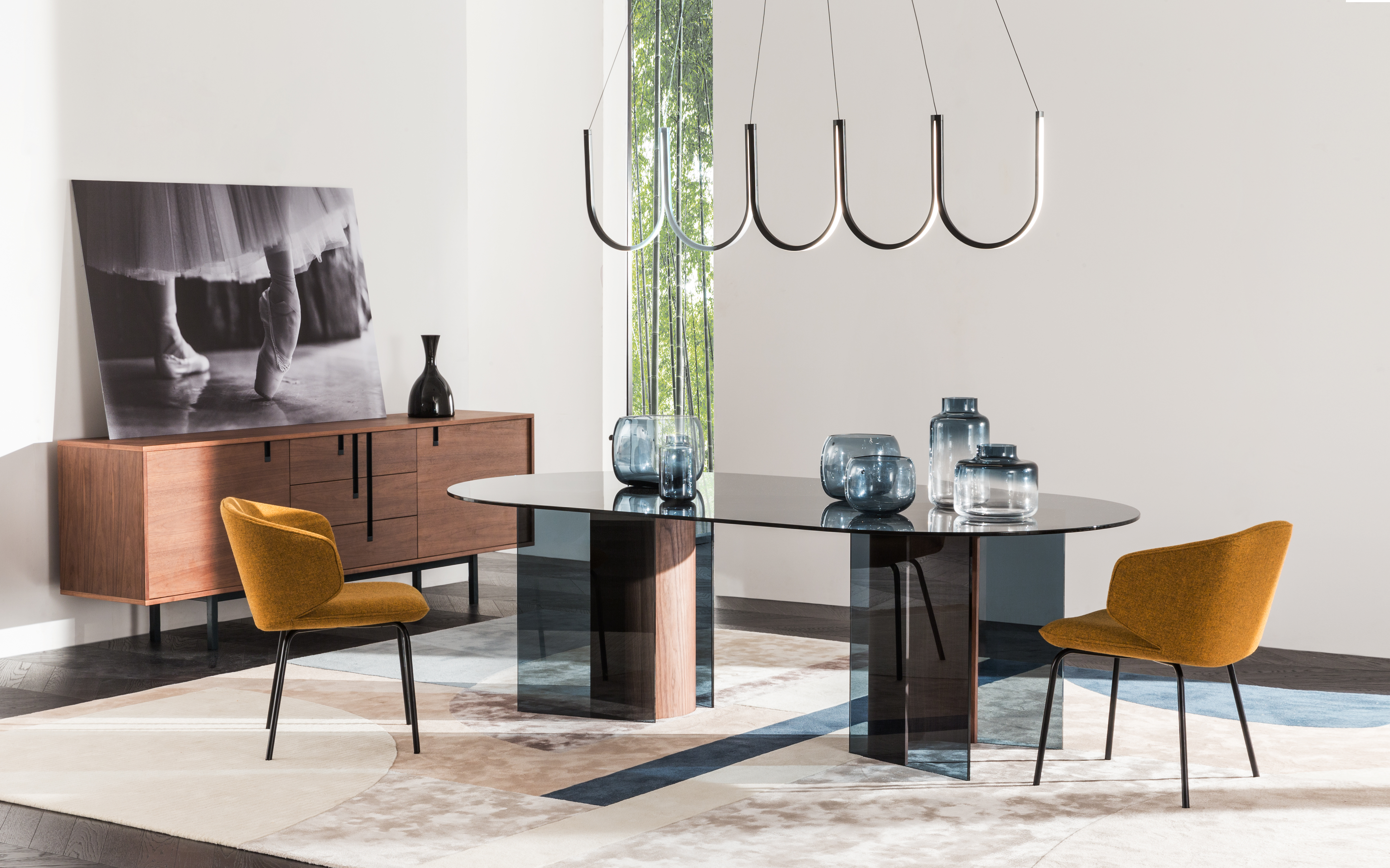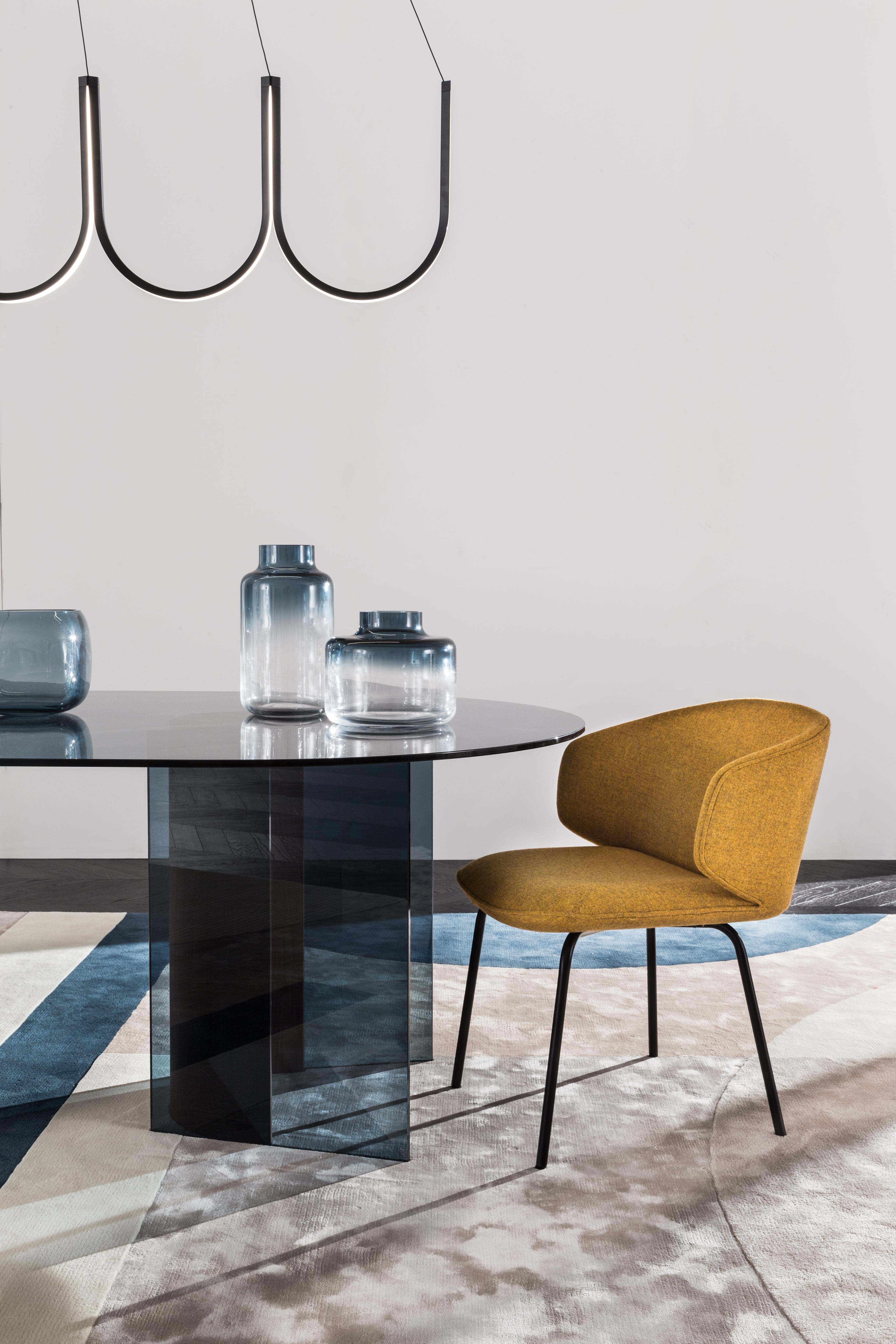 Sophisticated, straight metal legs and a "circle-in-square, square-in-circle" design gives BOLA dinning chair a fresh appearance. The back of the seat surrounds like an open wing, creating a comfortable space in the middle and a smiling curve. BOLA chair is the most elegant seat and appears exquisite when seen from any angle.