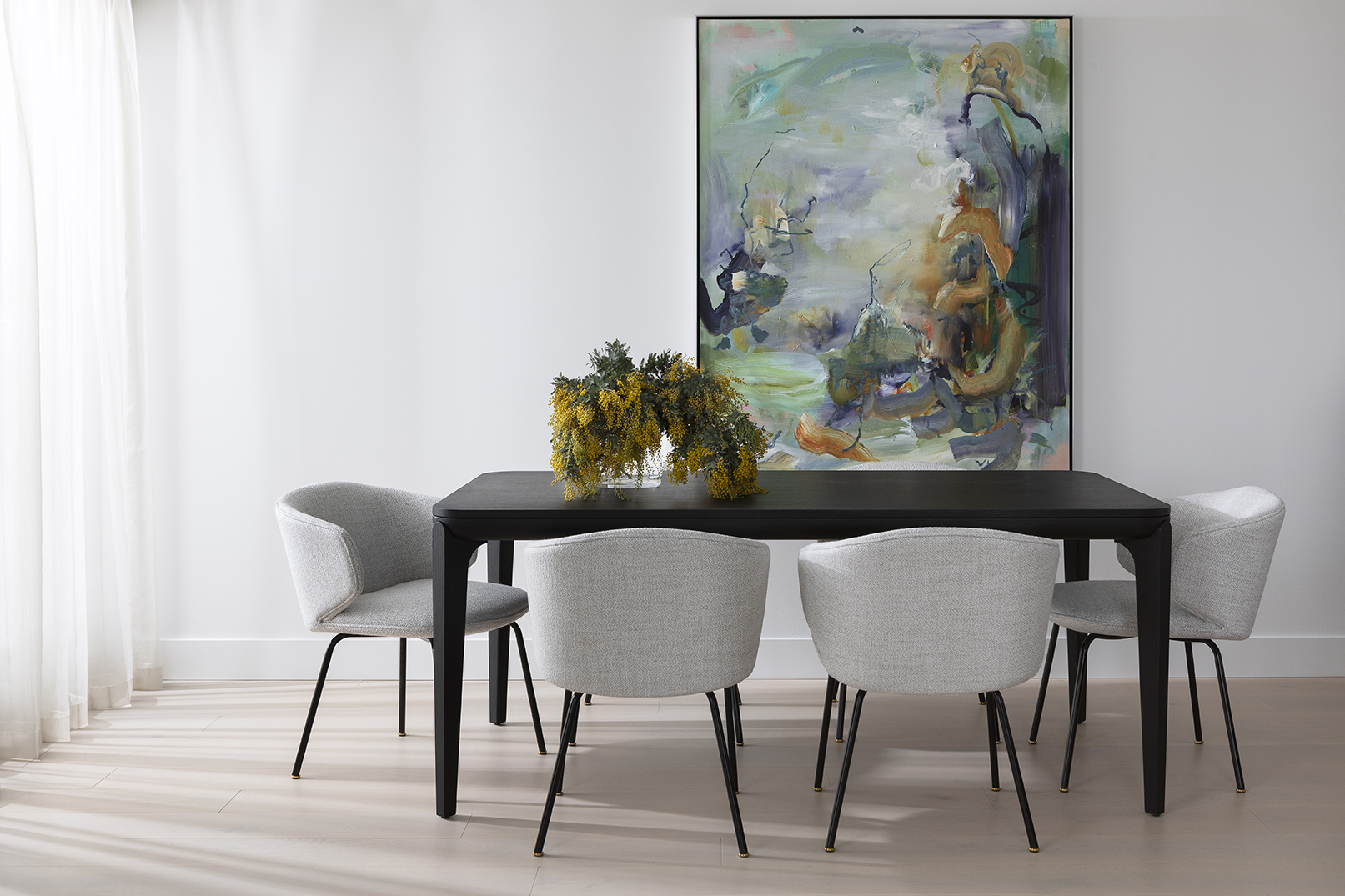 Upholstered with fabric or leather. Metal Legs in black satin finish, feet in champagne gold titanium plating. SEAT HEIGHT: 450MM