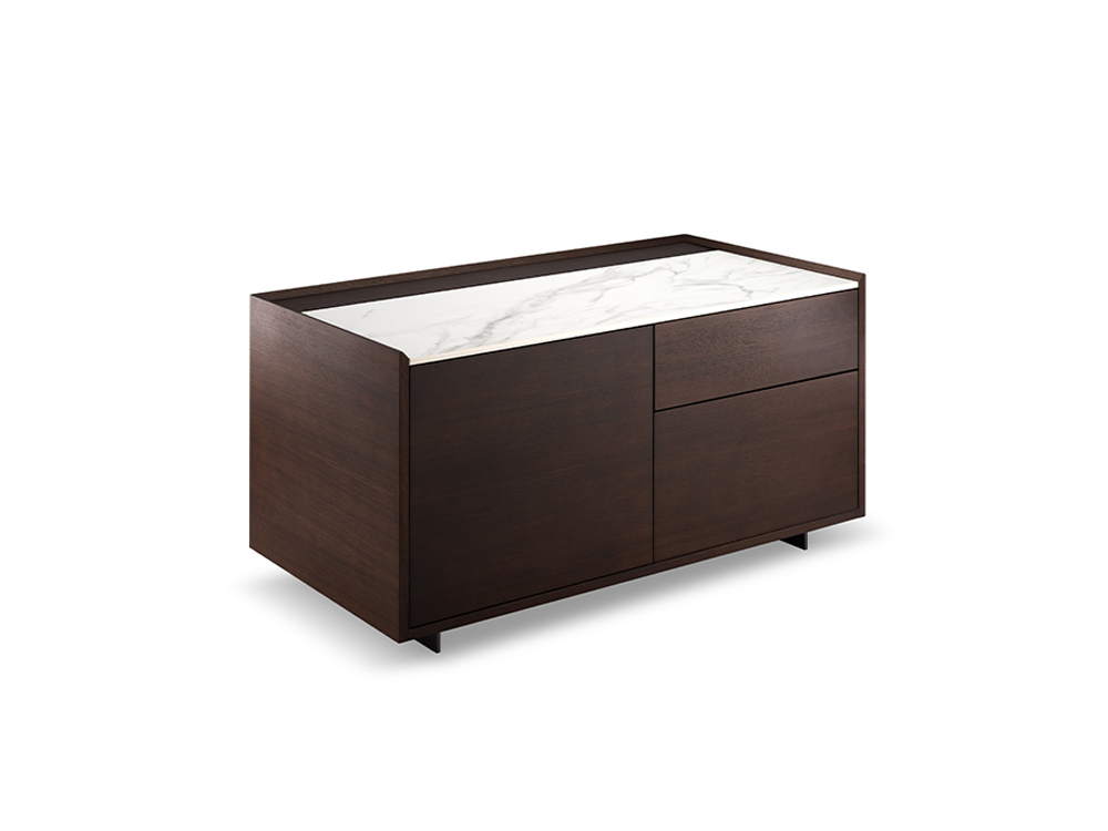 Cabinet is made of wood with sintered stone top, metal feet are in dark grey epoxy paint finish.