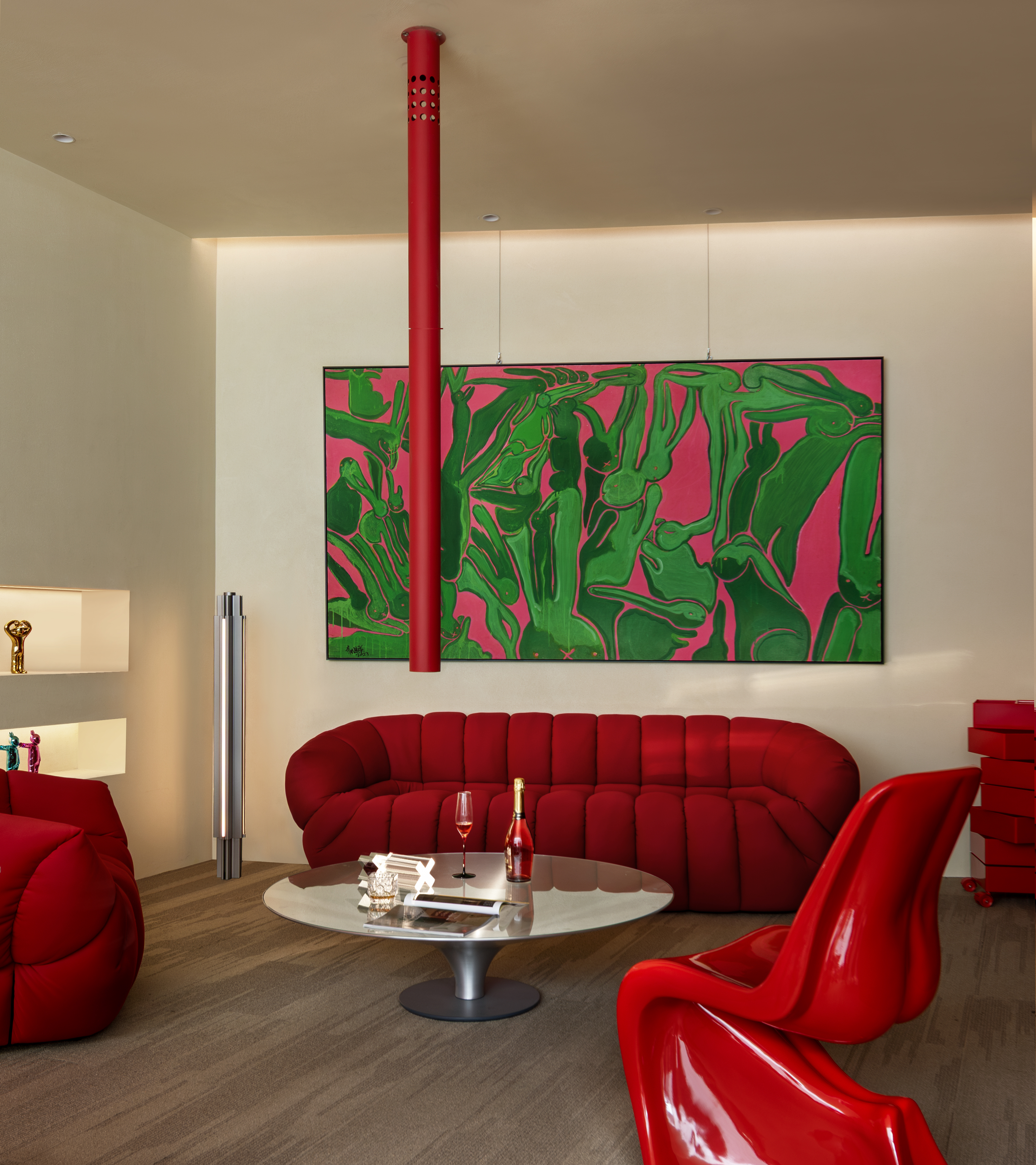 The CUDDLE armchair draws inspiration from the oversized puffy down jacket, incorporating a meticulous piece-by-piece sewing technique. Thoughtfully crafted with channel quilting, memory foam, and down feather filling, it ensures a supremely comfortable seating experience, perfectly suited for a relaxed, laid-back lifestyle in contemporary living.