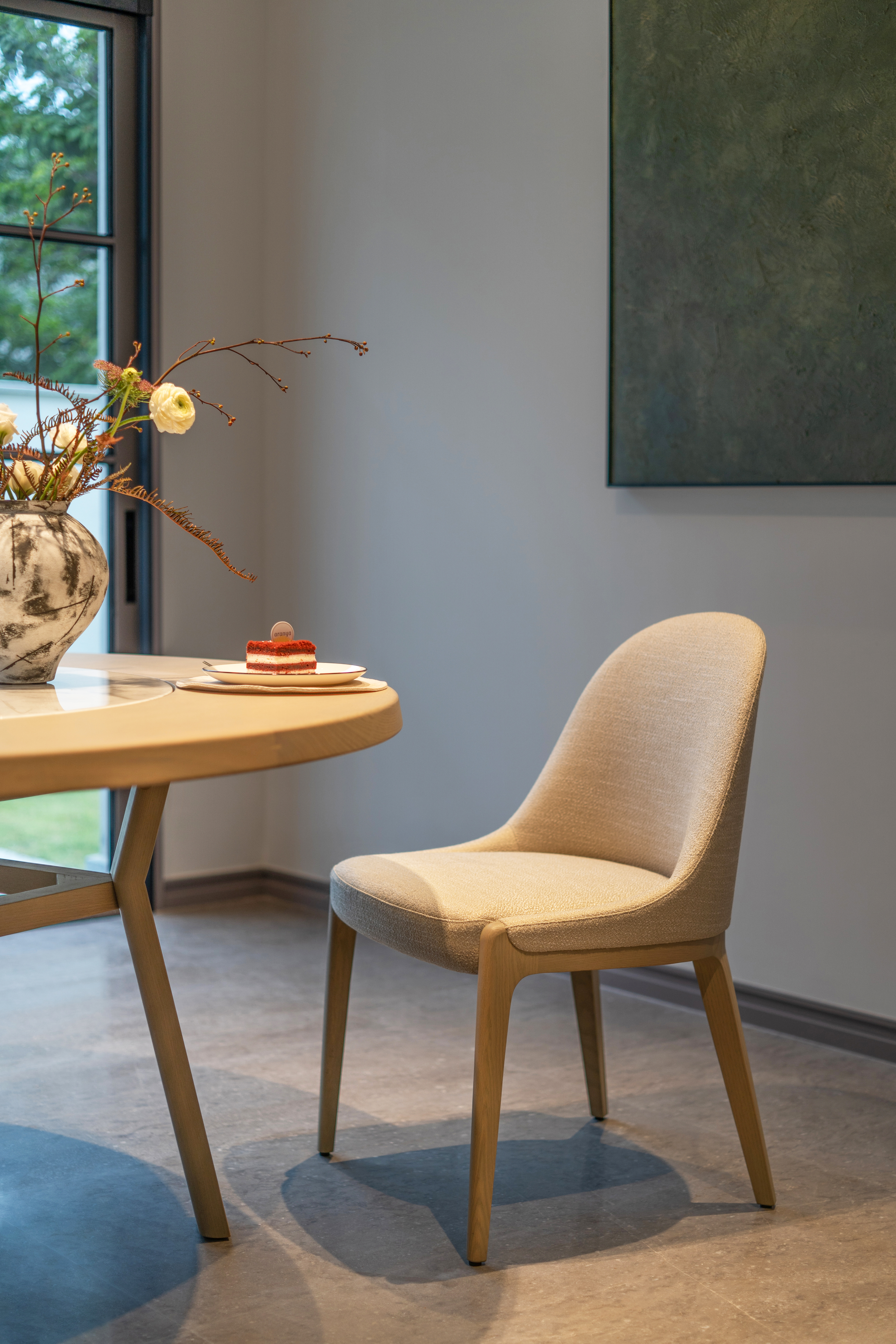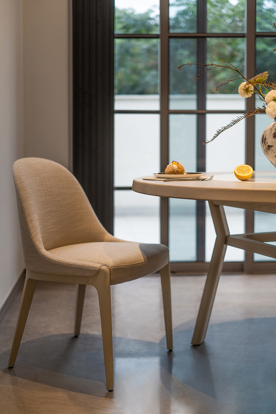 Upholstered with fabric or leather. Legs in solid wood.??SEAT HEIGHT: 450MM